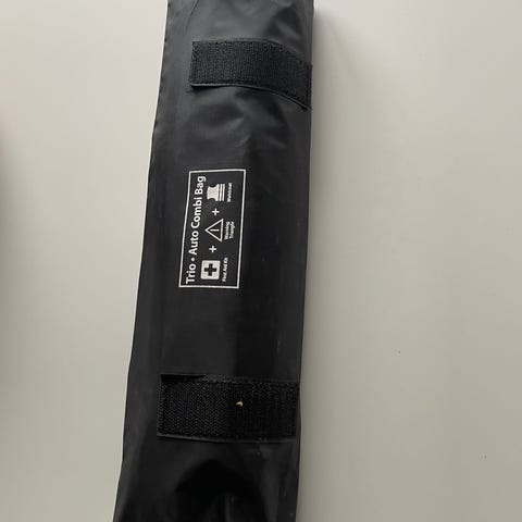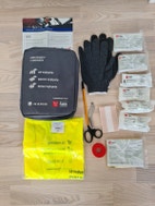 Førstehjælpsudstyr, Førstehjælpstaske til bilen indeholdende det, der ses på billedet. Det har ikke været i brug, men taske har lidt mærker hist og pist.