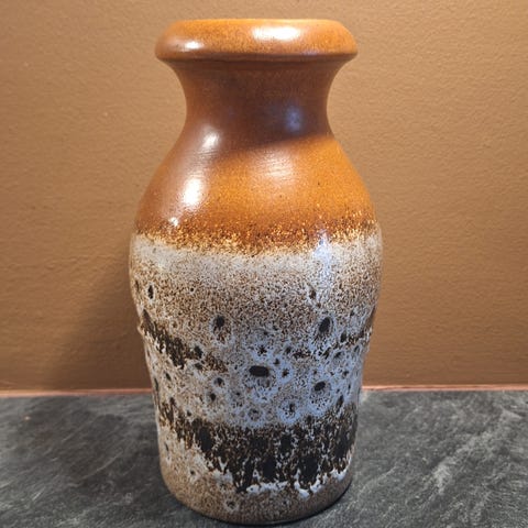 Skøn og meget speciel stentøjs vase fra Strehla GDR i gråmeleret sten og orange mønster. H. 14 cm.