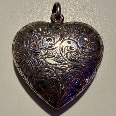 Vedhæng, sølv, 925 JOA, Sølvhjertet. Romantisk smukt hjerteformet gammelt vedhæng i sterling sølv stemplet med 925 og JOA. Kommer med små hjerter i det store hjerte og fine facetslebne klare sten. Min nye diamant tester synes at stenene er hvide safirer. Flot sølvarbejde fra JOA. Der kan være 3 forskellige sølvsmede. Det kan være Jørgen Andersen aktiv fra 1978-1986. Eller Jan Nielsen eller Jens Otto Astrup aktiv fra 1995..