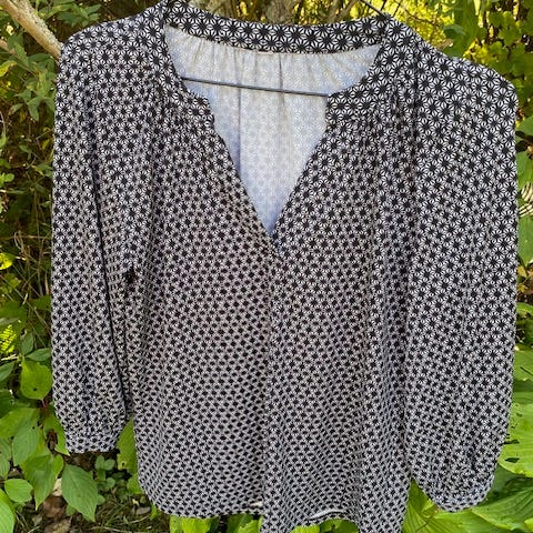 Bluse, jansons konfektions fabrik, str. 36, råhvid med sort mønster, bomuld, Næsten som ny, en kortærmet bluse , skjorte fra 1977 syet på jansons konfektionsfabrik i Skive . i stort set ubrugt stand . str 34- 36 . med 2 forlommer og ringe på bånd ved ærmer og lommer, så ærmerne kan hejses op og blive kortere. hentes her eller sendes for købers regning