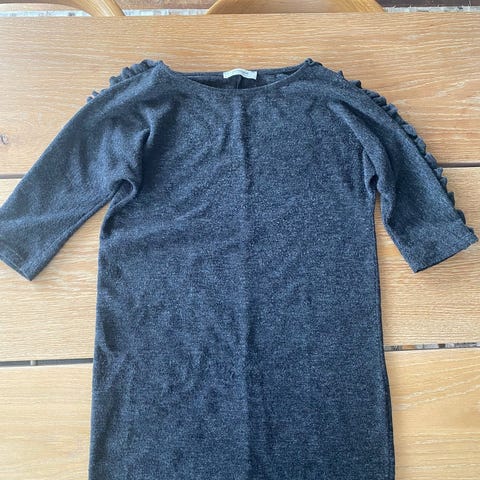 Strikkjole, Message , str. L, Sort, God men brugt, Mange fine detaljer, med mønster (gennemsigtig). Langt bindebånd og ribkant i taljen. Den er en lille str large.