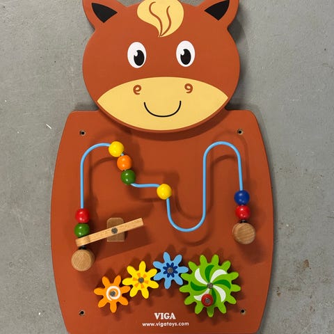 Voila aktivitetslegetøj med spejl, inkluderer farverige blomster og figurer på en grøn base. Legetøjet er designet til små børn og fremmer sanseudvikling og motoriske færdigheder.