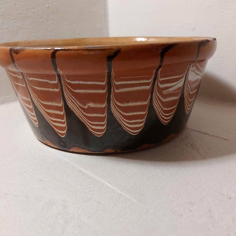 Keramik, Skål, Gammel hånddekoreret lerskål, lille, ca. 6 cm høj og 6,5 cm i diameter.