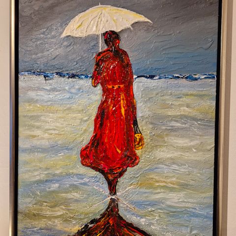 Akrylmaleri, Leif Rabøl, 35x70cm , "Elegant kvinde i blæse vejr. ( Nr. 23 )