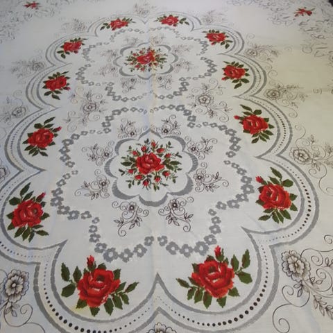 Dug med roser, Meget smukt dug / stykke stof med syede kanter og med lyserøde romantiske roser.