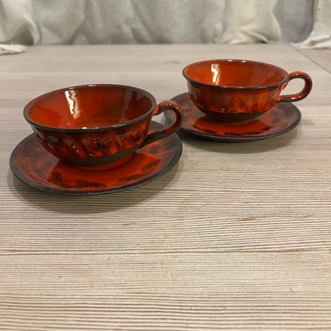 Andet, Antikke Bakelit kopper , Gerrit, 5 næsten antikke kopper af bakelit fra 1940.erne - velegnet til skovturen, feriehuset og såmænd også hjemme i haven - i det spændende materiale bakelit- kop og underkop - 5 stk i fin stand - enkle og meget smukke i en rød-brun afdæmpet farve.