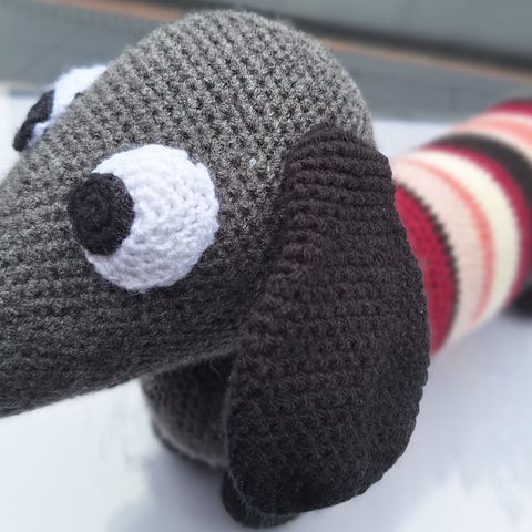 Hæklede gravhunde, kunsthåndværk, Store, nuttede og dejlige gravhunde på hele 35 cm. De er hæklede i bomuldsgarn og har lækre, bløde pelsører, der er lige til at nusse.