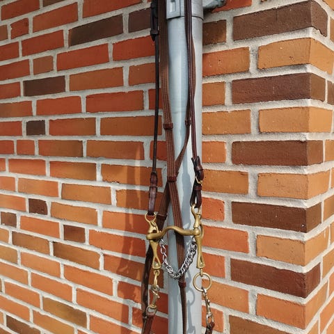 Remme til stigbøjler, gjord + lammeskind, tøjler, en grime og et underlag