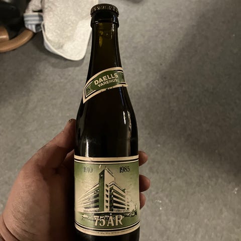 Daells varehus 75 års jubilæums øl, tappet hos Wiibroe i 1985. Lidt tæring på kapslen men ellers pæn stand. Se billederne.