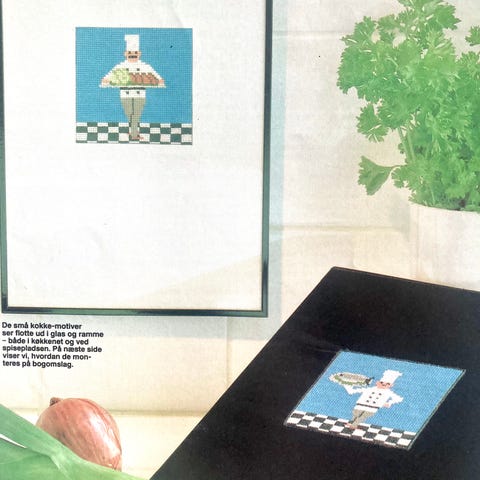 Mønsterark samt et par sider fra månedsmagasinet Alt om Håndarbejde (Nr. 9 1981) med broderimønster / tællediagram samt arbejdsgang til nogle fine broderiprojekter med Russiske Babuska dukker broderet i korssting.