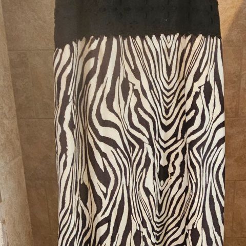 Kjolen: stoffer blødt og let skinnende. Flot ærmer med små knapper og mønster. Længde på kjolen ca. 85 cm. Bred fra ærmegab til ærmegab 42 cm.