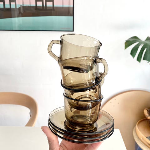 Glas, Kaffekopper, tallerkener, Arcoroc France, Skønt fransk stel fra franske Arcoroc i varmebehandlet glas. Stellet har almindelige brugsspor.