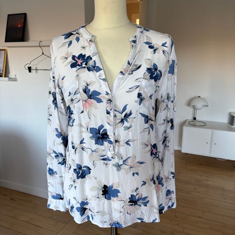 God men brugt, Skjorte - bluse str. L fra Soft Rebels. 100 % viskose. Sort bund med blomsterprint i blå, mint og rosa nuancer.