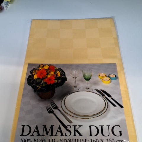 Damask dug, Thomas Frederick, Flot hvid damask dug med bladmønster, ca. 140 x 140 cm. 100% bomuld. Dertil hører 2 x servietter i samme stof - 50 x 50 cm.