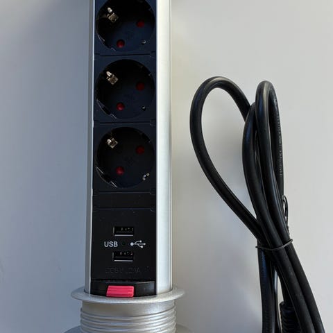 DESKTOP POP-UP POWER STRIP, "DELTACO", Pop-up Strømskinne til Kabelgennemføring (60mm) i bordplade el andet, 3x220v, 2xUSB A-Port, Overbelastningssikring, Kontakt, 16A, 250v,