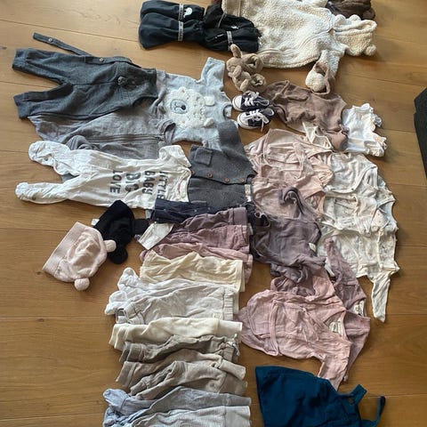 Det hele er brugt og enkelte dele har nogle skjolder, samt den brune cardigan mangler en knap og der er en plet på hårbåndet ellers fint