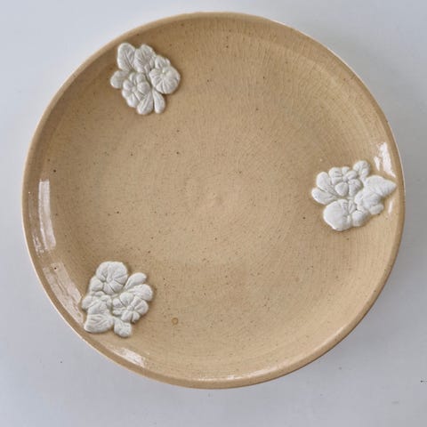 Lille kagetallerken i lysegul fajance med hvid pibelersdekoration. Diameter 14,5 cm.