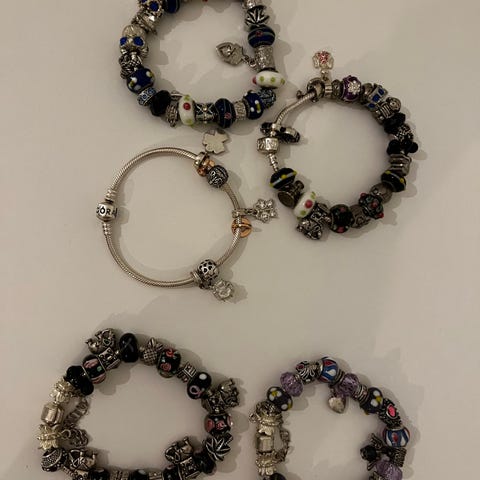 Armbånd, sølv, Pandora, Sølv armbånd med 5 charms fra Pandora, sælges samlet