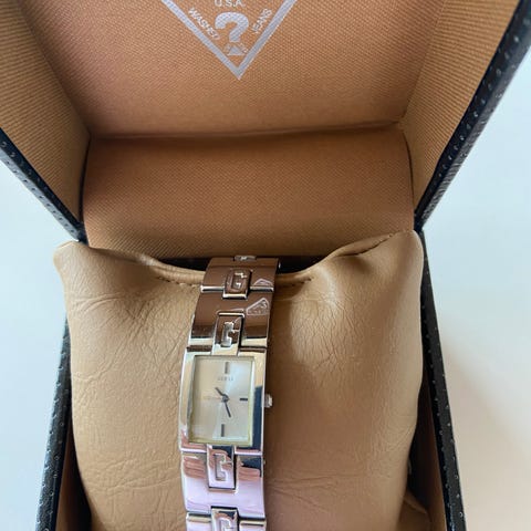 Lille dameur fra Guess med sort urskive og mat lænke. Uret har lidt brugsspor og trænger til nyt batteri.