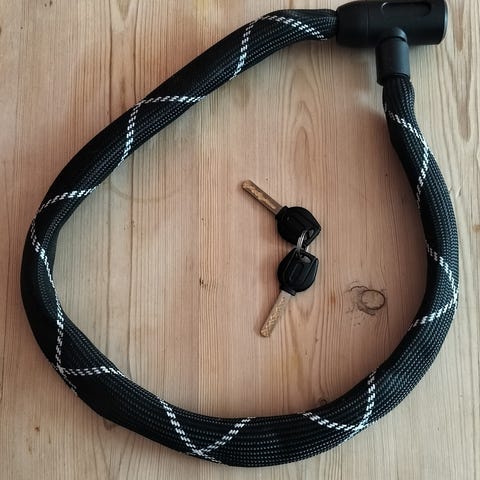 En 10mm kæde i hærdet stål overtrukket med en stofstrømpe for at beskytte det du låser fast.