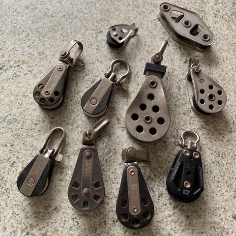 Enkelt blokke med svirvel og kuglelejehjul i aluminium. Med sideplader i kulfiber/carbon. 3 forskellige størrelser. Har 2 af hver.