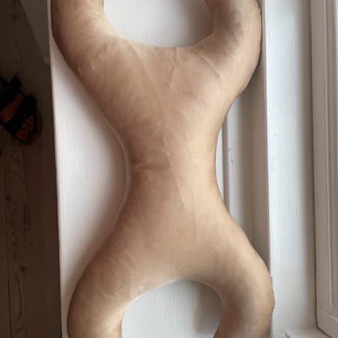 Brugt i en måneds tid og har derfor lidt brugstegn. Men man kan købe nye betræk - også i silke - i flere farver. Der medfølger et betræk i bomuld, der sidder på puden.