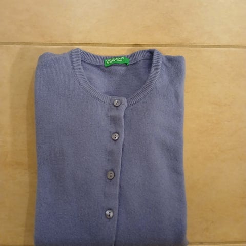 Uld-cardigan fra Benetton (cashmere blend, Italian yarn) i størrelse S. Trøjen har ribkanter og lukkes med sorte knapper foran. Vaskemærket er klippet af, men det er håndvask. Brugt, men god. Jeg har fjernet fnuller med en fabric shaver og haft den i blød i Wool & Cashmere conditioner, så den er blevet dejlig blød igen.