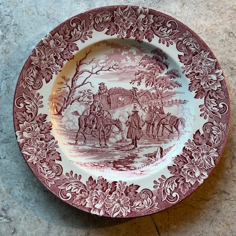 Fajance, 5 flotte tallerkener, Adams, 5 flotte tallerkener fra Adams England, fra Serien Charles Dickens.