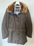 Brun gåsedunsfrakke med tovejs lynlås, knapper, hætte og aftagelig pelskrave. Jakken har mange lommer både udvendigt og indvendigt. Kan bruges både med og uden bælte.