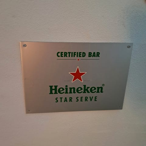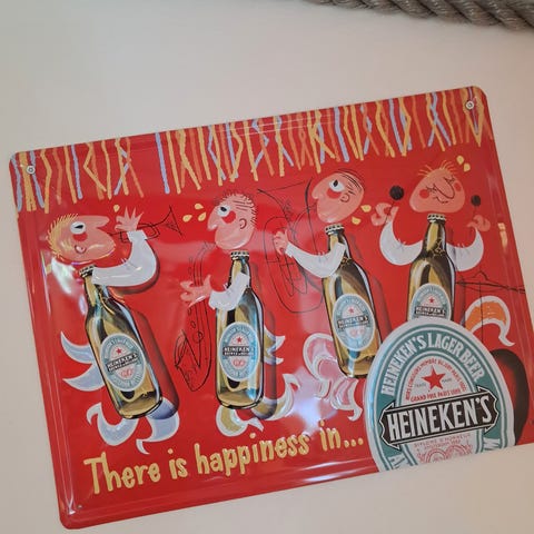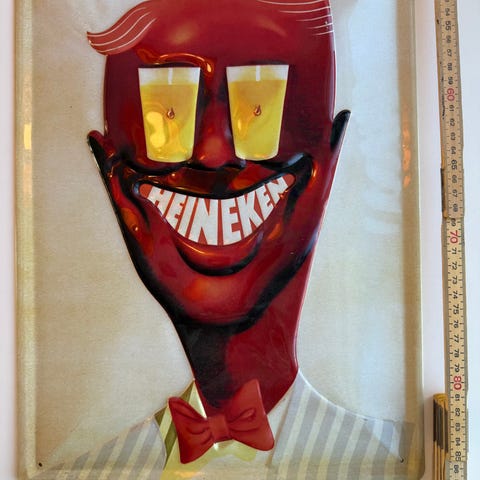 Skilte, Serveringsbakke, Heineken serveringsbakke, har hændt på væggen her, så der er et hul i bakken til en skrue.