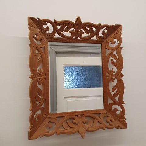 Fint lille udskåret træ spejl med patina, Sia, Måler 29x35 .Kan både stå og hænge.