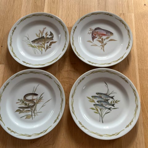Porcelæn, Fisketallerken, Mads Stage, 6 stk. Mads Stage frokost silde tallerkener 21 cm. Med 5 forskellige motiver. Kr. 50, per stk.