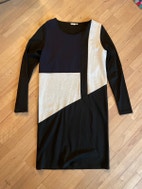 Kjolen sidder tæt på kroppen men ikke stramt. Den har et mønster hvor der er inddelt felter med farverne mørkeblå, lysegrå som giver kjolen spil.