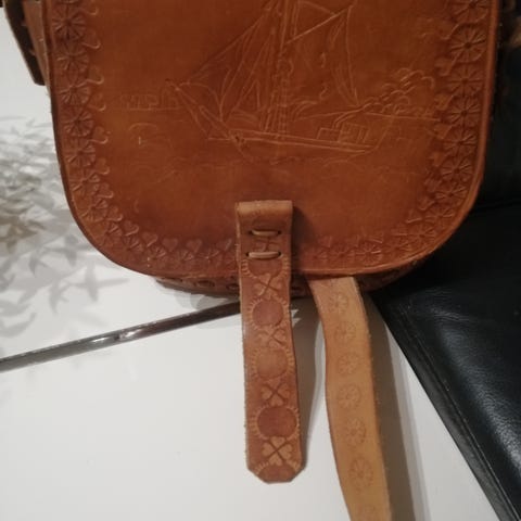 Lækker cognacfarvet læder / ruskindstaske med lang, justérbar skulderrem, indvendige og udvendige lommer. Sort bomulds-foer.