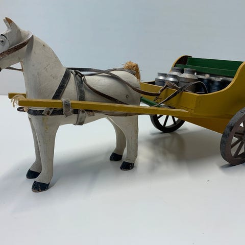 Legetøj, 2 stk antikke landbrugsredskaber og hest i træ.