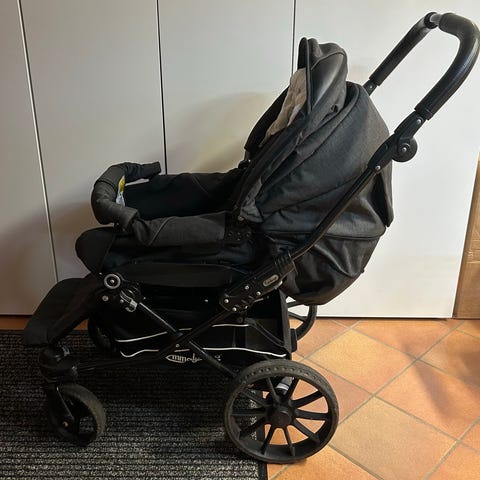 En solid klapvogn med drejehjul, kan lægges helt ned i ryggen så barnet kan sove i den når man er på tur.