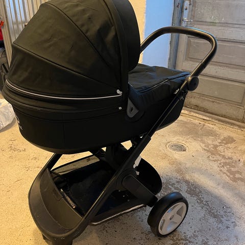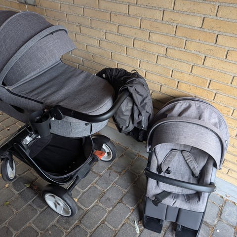 Der medfølger regnslag (Stokke regnslag) og et myggenet. Der medfølger også (baby)indsats til klapvognsdelen.