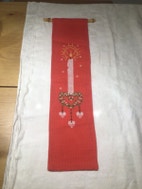 Klokkestreng med lys, Gran og hjerter, Håndbroderet på rødt stof.