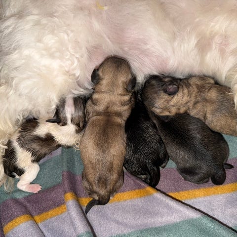 PS. Jeg har erfaring trods min unge alder, og har prøvet DET før :-) Du kan se nogle af mine små hvalpe i billedkollagen. Der var ni levedygtige hvalpe i det seneste kuld.