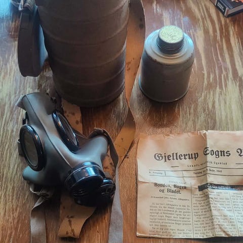 Militær, DDR NVA grå gasmaske, DDR NVA grå gasmaske med filter i lærredstaske fra før murens fald i 1989