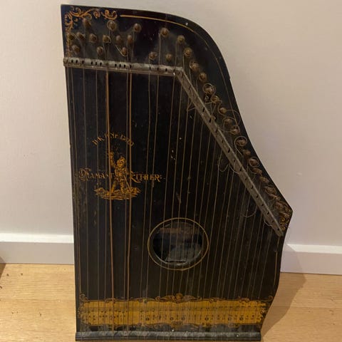 Strygelyre - Tagelharpa, Dansk 4 strenge, Strygelyre (Tagelharpa på svensk). Strenge af hestehår. Lyren er i gran med massivt dæk. Stemmeskruer, strengeholder og stol i hårdt træ.