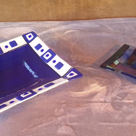 Glasfad, Unika, Unika glasfad 40x40 indlagt pynt, Smukt unika glasfad sælges. Kvadratisk 40x40 cm og buer let opad i hvert hjørne. Købt på kunstudstilling for ca 20 år siden af kvindelig dansk glaskunstner. Det fremstår i samme stand som da det blev købt. Fadet består af to glasplader hvorimellem der er smeltet 16 felter af Jyllandsposten (hvad man ikke skulle tro) og kobbertråde, så fadet fremstår utrolig smukt og helt specielt. Glasset har en svag grønlig tone. Det er smukt med frugt, bloklys eller bare alene. Vi sender gerne på