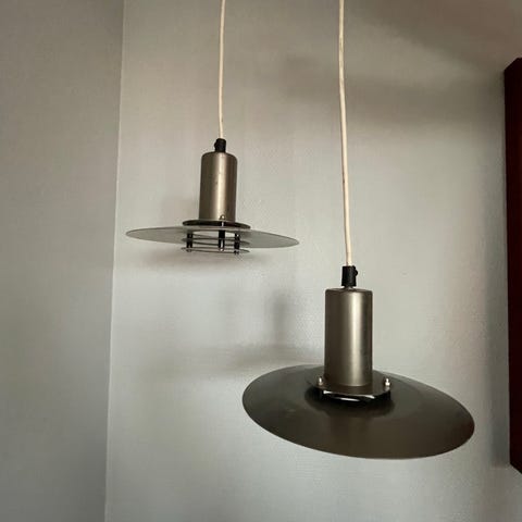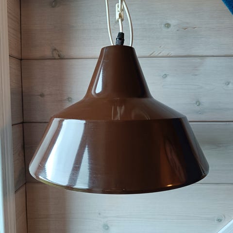 Denne vintage-loftlampe fra 70'erne er klassisk dansk retro-design. Den er udfærdiget i stål, og har en diameter på 25cm. Den passer perfekt i et arbejdsværelse, badeværelse eller entre. Lampen har sin originale etiket, Fatning, hvid stofledning og står i t flot stand.