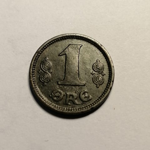 Fin 1-øres mønt fra 1927 N. Mønten er lavet af bronze. og fra da Christian d. X var konge i Danmark
