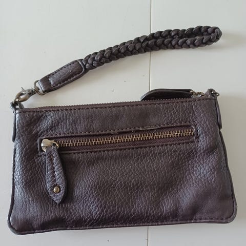 Clutch, andet mærke, polyester, Bewstyle Brun clutch med sten og brunt stof i folder foran. Clutch har lille kædestrop og lang kædestrop medfølger. Clutch har lukning med 2 metalkugler.