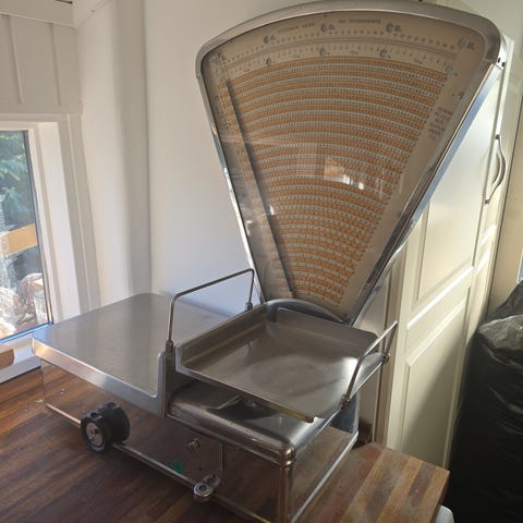 Vægt, Wistoft, Flot gammel Wistoft vægt der vejer op til 10 kg på en af de 2 plader - det styres med en omskifter. Den er dejlig tung, så du skal ikke komme på cykel og hente den ;-)