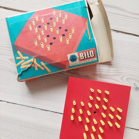 BILO, Regn den ud - sæt pindene over hinanden og end med 1 pind i midten. Strategi spil for sig selv. Gammelt spil. Fuldstændig intakt og med lille pung, som det kan være i. Nem at have med på rejsen eller ferien til afslapning. Kan spilles igen og igen.
