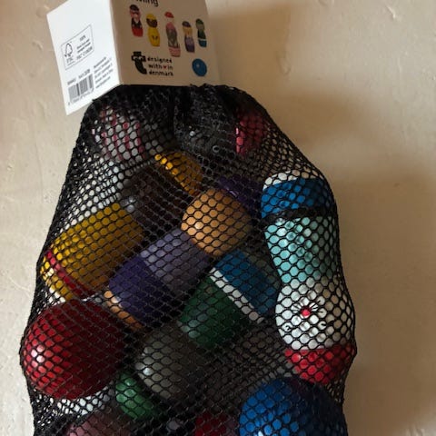 Spil bowling på græsplanen eller bordet. Små trækegler, 3 røde, 3 blå og 3 gule til at spille mini bowling. Sort kugle. Bare for sjov. Fint og velholdt.