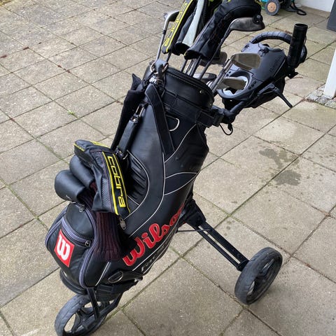 Andet golfudstyr, Wilson, Wilson vognbag med Wilson dame driver, jern (5 - P) plus fairwaykølle og putter. Sandjern mangler. Hertil kommer en golfvogn BagBoy). Golfopsamler og paraply kan følge med.
