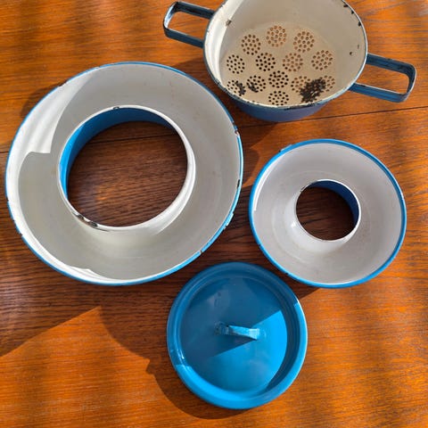 Madam blå, har også lidt rød og lidt hvid og lidt beige emalje køkken ting.